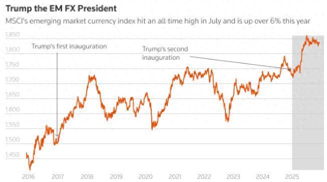 新兴市场货币表现强劲得益于美元波动性增强且持续走弱,这促使投资者重新审视对美元的投资敞口,并对长期以来美元的强势和全球货币地位提出质疑。与此同时,他们正在押注一些发展中国家(从南非到匈牙利)的经济价值增加,以摆脱对美国资产的依赖。