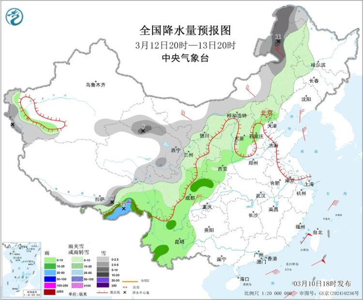 图1 全国降水量预报图(3月10日20时-11日20时)