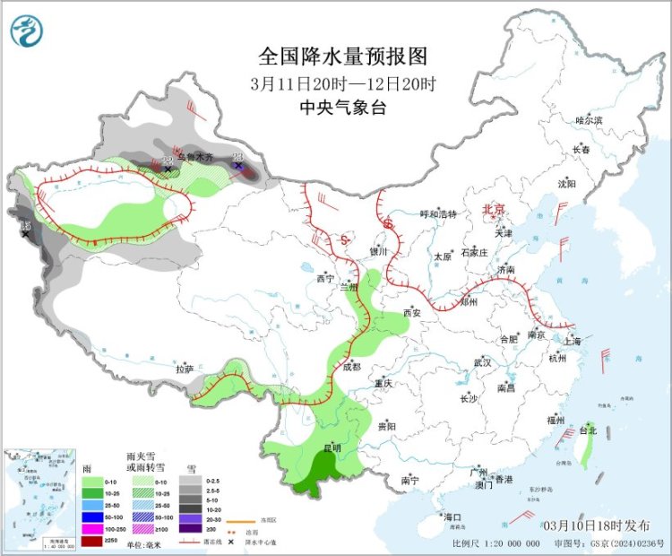 3月10日20时至11日20时,新疆南疆西部山区和北部、西藏西北部等地部分地区有小到中雪或雨夹雪,其中,新疆北疆北部和南疆西部山区等地部分地区有大到暴雪,局地大暴雪(20~25毫米)。新疆南疆盆地西部、黄淮东部、江淮、上海、云南西南部等地部分地区有小到中雨,其中,云南西南部等地局地有大雨。新疆沿天山地区和东部、西藏北部、甘肃河西等地部分地区有5~7级风,其中,新疆沿天山地区部分地区有6~7级风,新疆东部部分地区有8~9级风;台湾海峡、巴士海峡、南海西部、东北部和南海中东部海域将有5~6级风、阵风7级。新疆东部和南部、内蒙古西部、甘肃西部等地部分地区有扬沙或浮尘,局地有沙尘暴(见图1)。